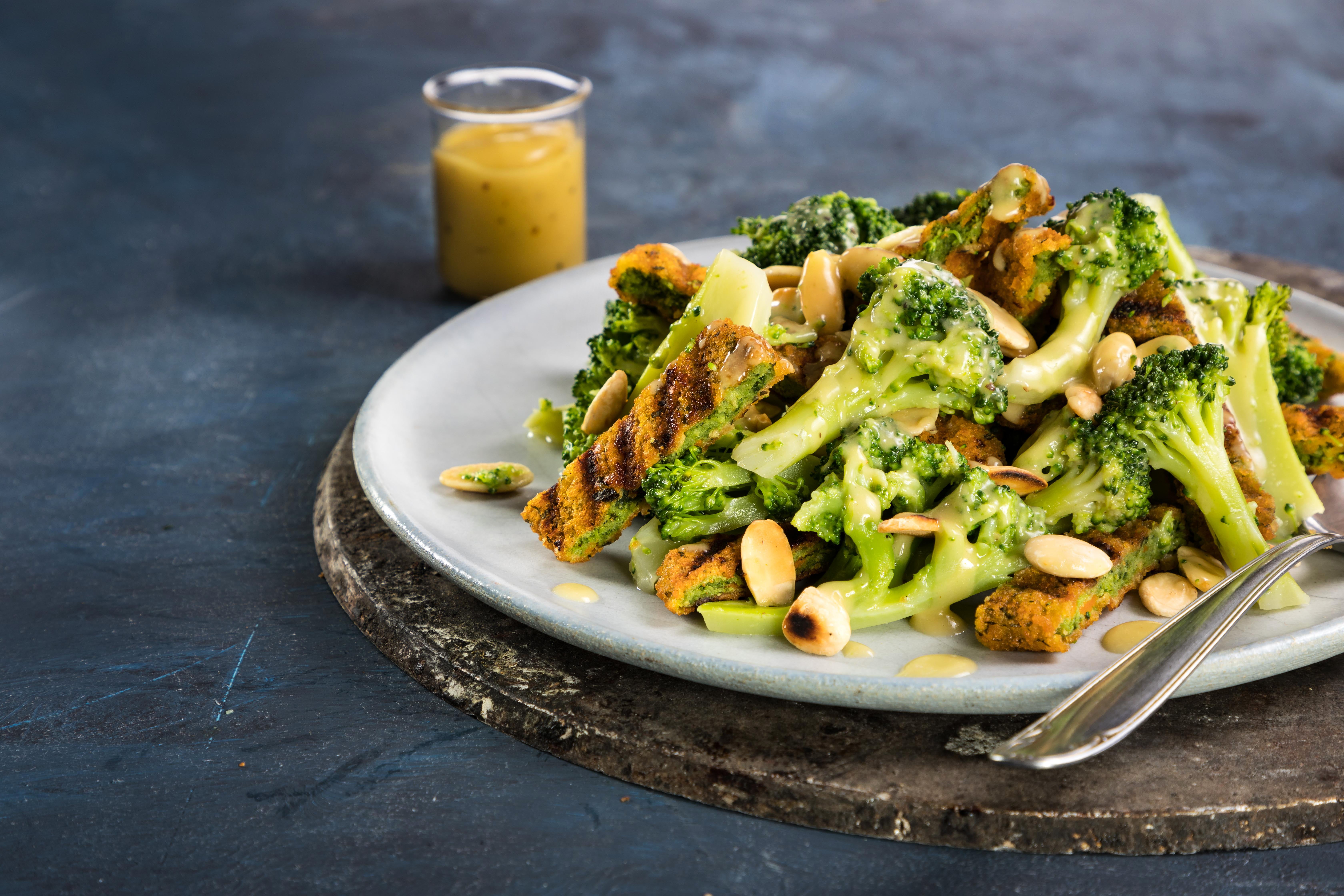 סלט פרחי ברוקולי, שקדים קלויים ושניצל ברוקולי