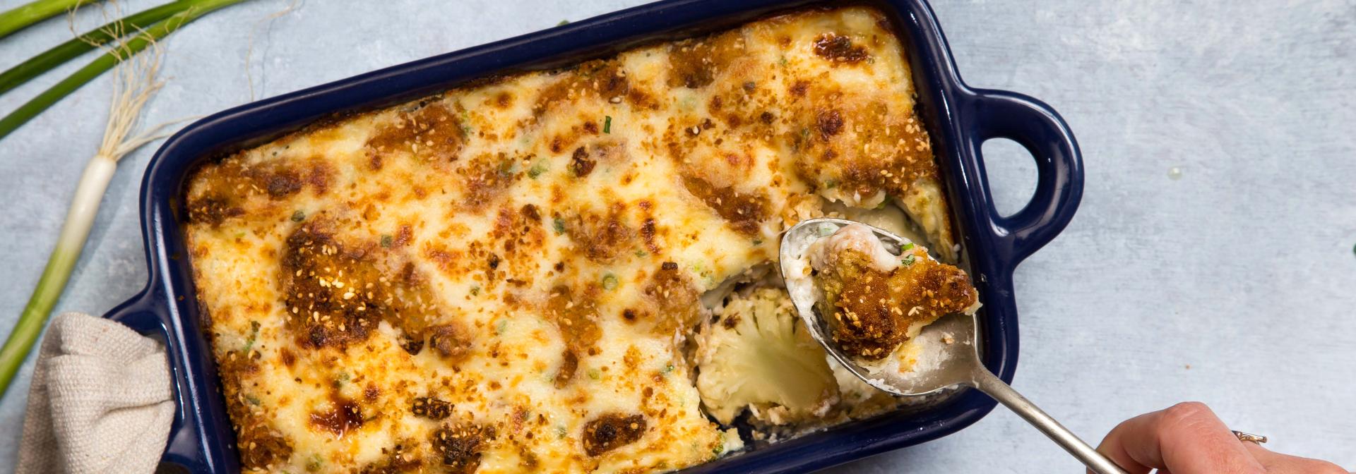 מחממים תנור לחום של 170 מעלות. מערבבים את הבשמל המצונן בעזרת מטרפה עד שהוא חוזר למרקם חלק. מוסיפים את הגבינות ואת העירית. מוסיפים את הכרובית ומערבבים בעדינות. מעבירים לתבנית אפייה בינונית, מעבירים לתנור החם ל - 20 דקות, עד להזהבה. מגישים חם.