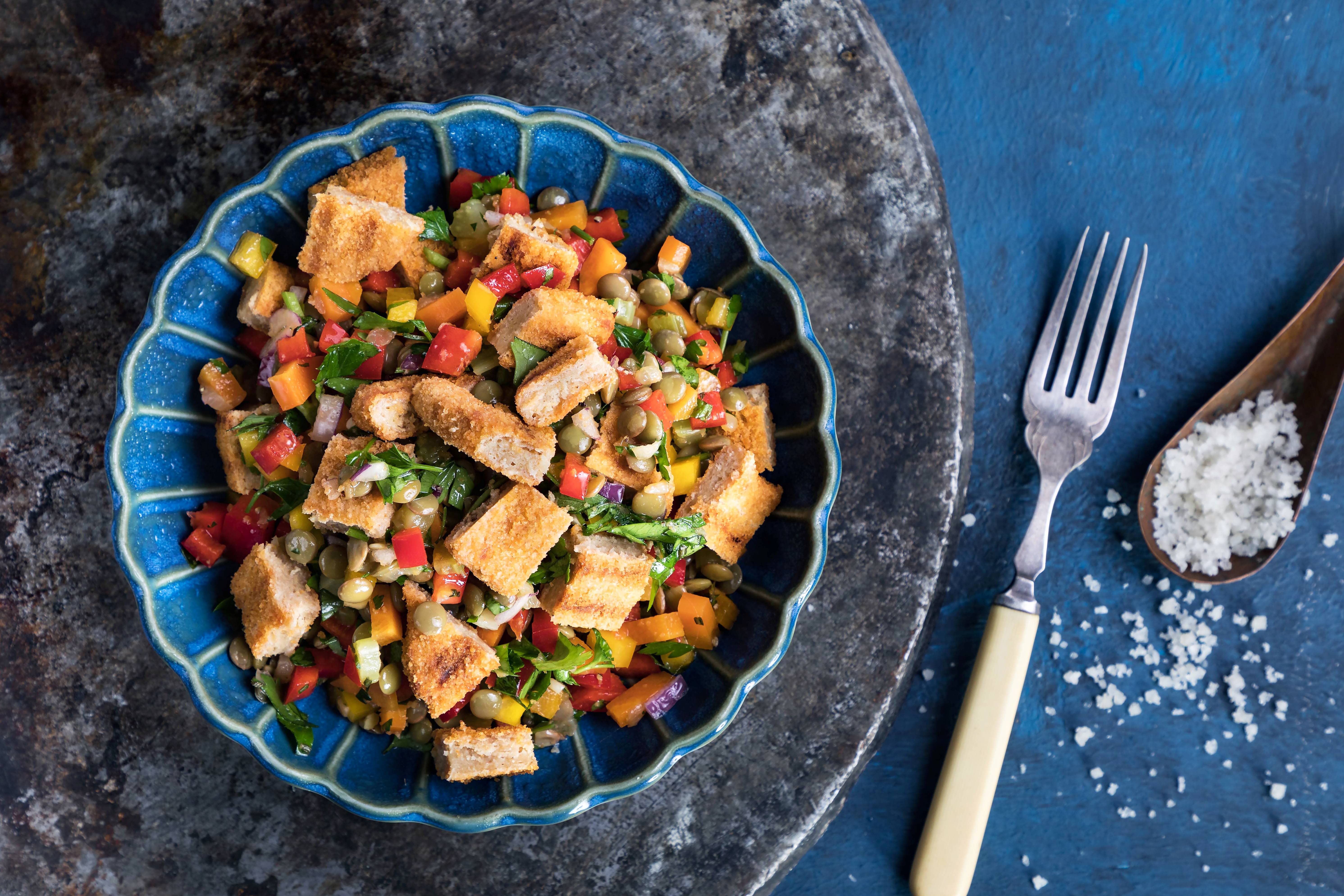 סלט עדשים עם גזר סלרי בצל ורצועות שניצל צמחוני