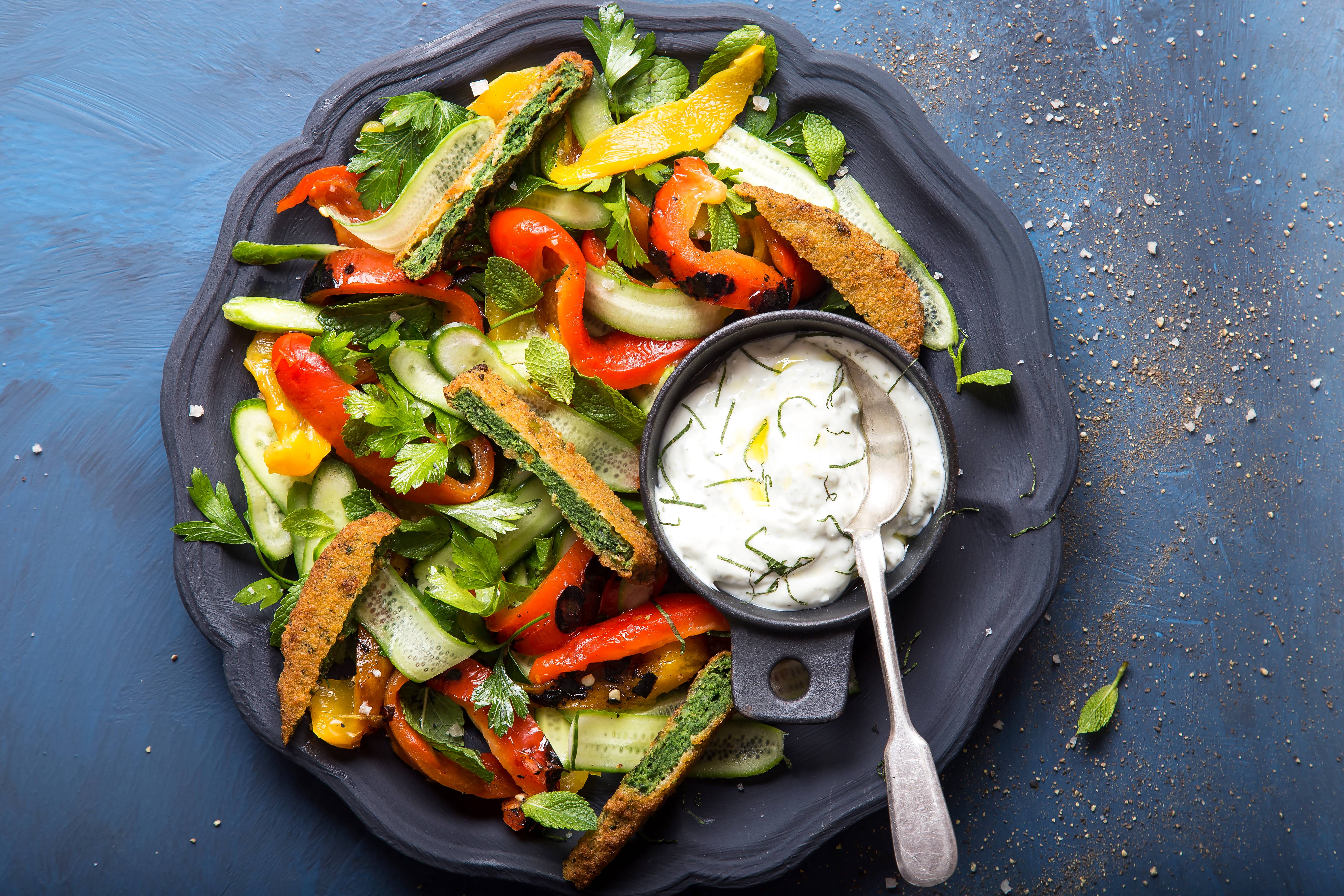 סלט של שניצל תרד 99 קלוריות, פלפלים צבעוניים קלויים וצזיקי