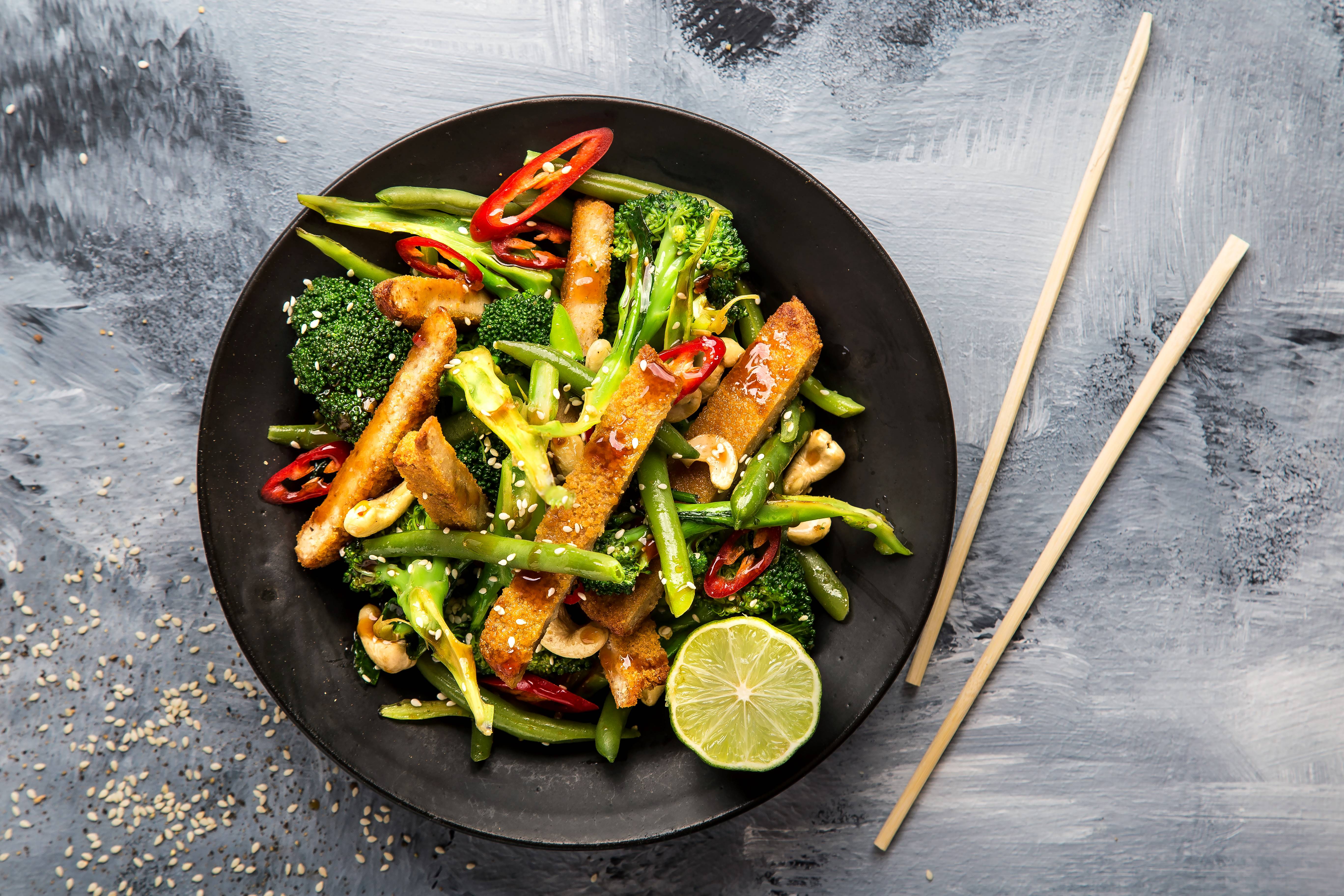 רצועות שניצל צמחוני מוקפצות עם שעועית ירוקה, ברוקולי וקשיו