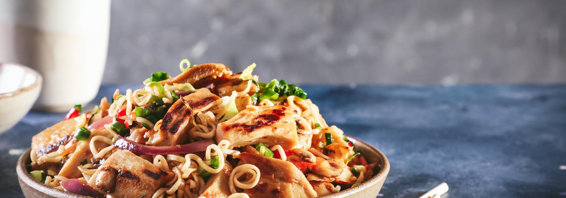 מוקפץ עם נתחי עוף צמחוניים ועסיסיים, פטריות, פלפל, כרוב, בצל סגול ומלא טעמים של תיבול אסייתי